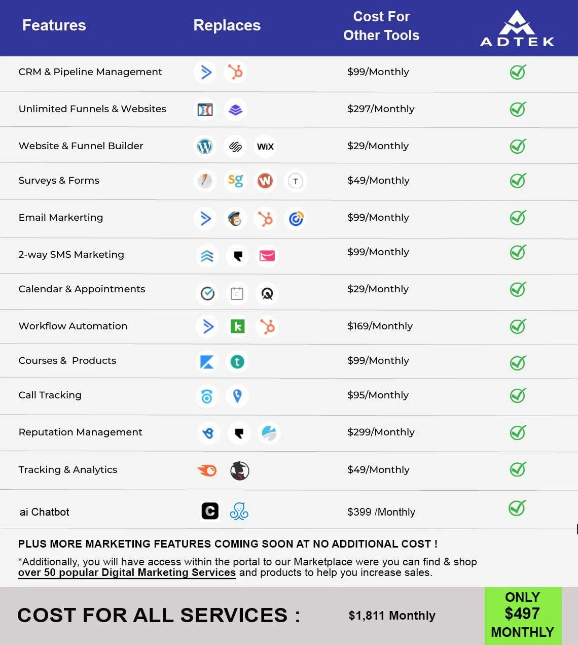 Manage all your Web Advertising, Reviews, Funnels, Leads, Automations, Websites, Social Media Postings, Messaging, Chatbots, CRM, Affiliates & more.